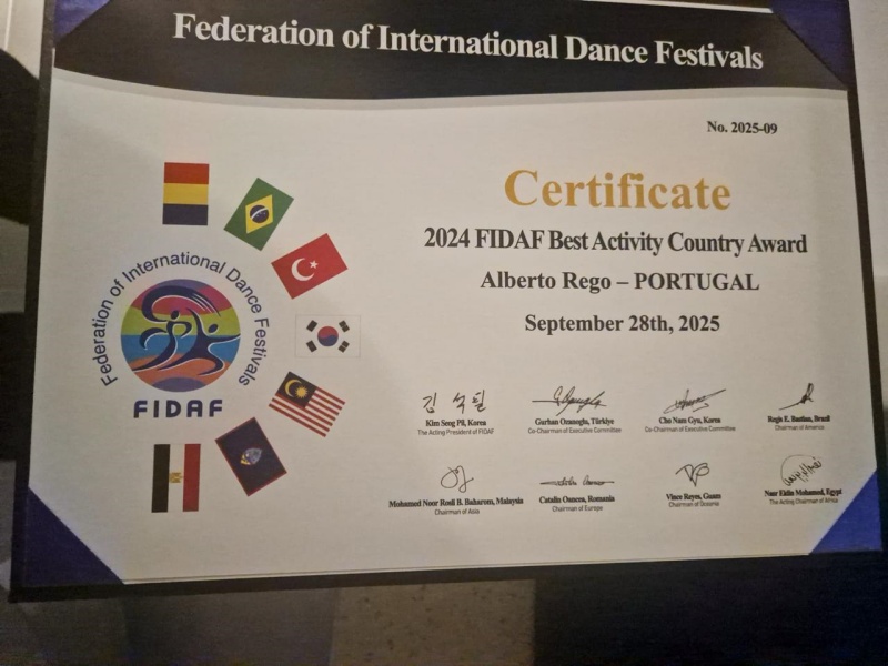 Alberto Rego acaba de regressar do Congresso Mundial da Federação Internacional de Festivais de Dança (FIDAF), que decorreu em Cheonan, na Coreia do Sul, trazendo na bagagem mais um prémio para Portugal. Esta entidade distinguiu o nosso país como “Best Activity Country 2024” – País com Melhor Atividade FIDAF 2024.